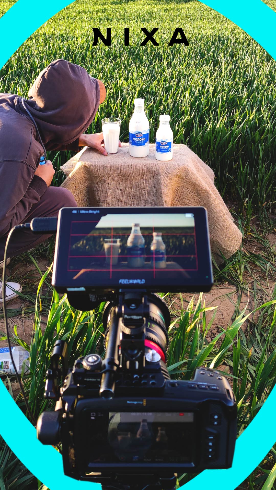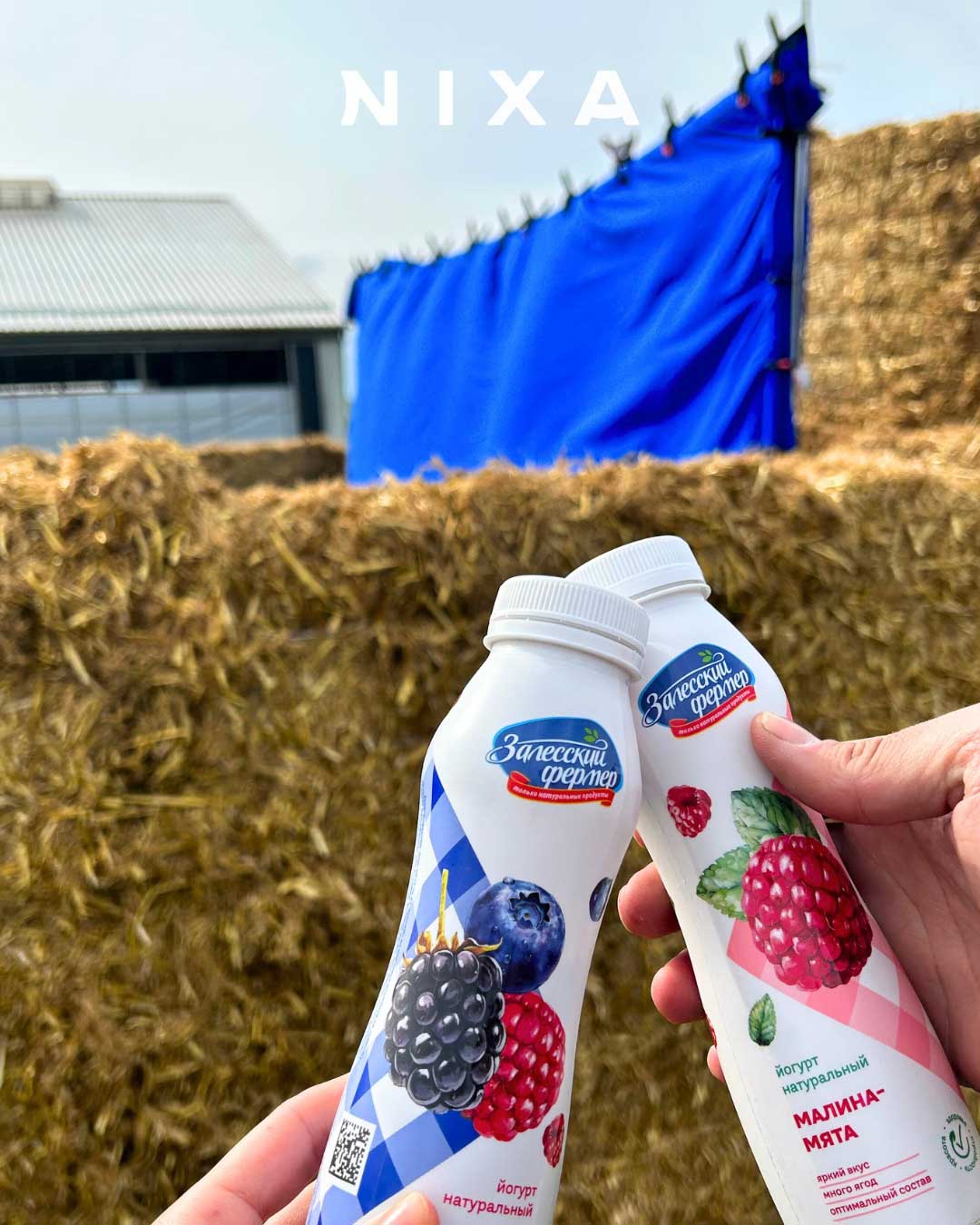 Так же мы сняли продуктовые кадры на природе с продукцией "Залесского фермера". Для этого мы нашли красивое минималистичное поле, где мы выставили реквизит, чтобы сделать сочные кадры. Это были тяжелые кадры, так как нам пришлось заехать в поле очень далеко и там в походных условиях сделать красивую выставочную витрину с продуктом. Получилось красиво и эстетично.
